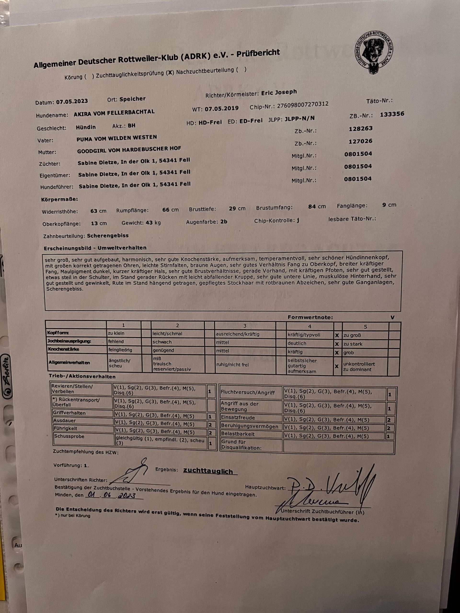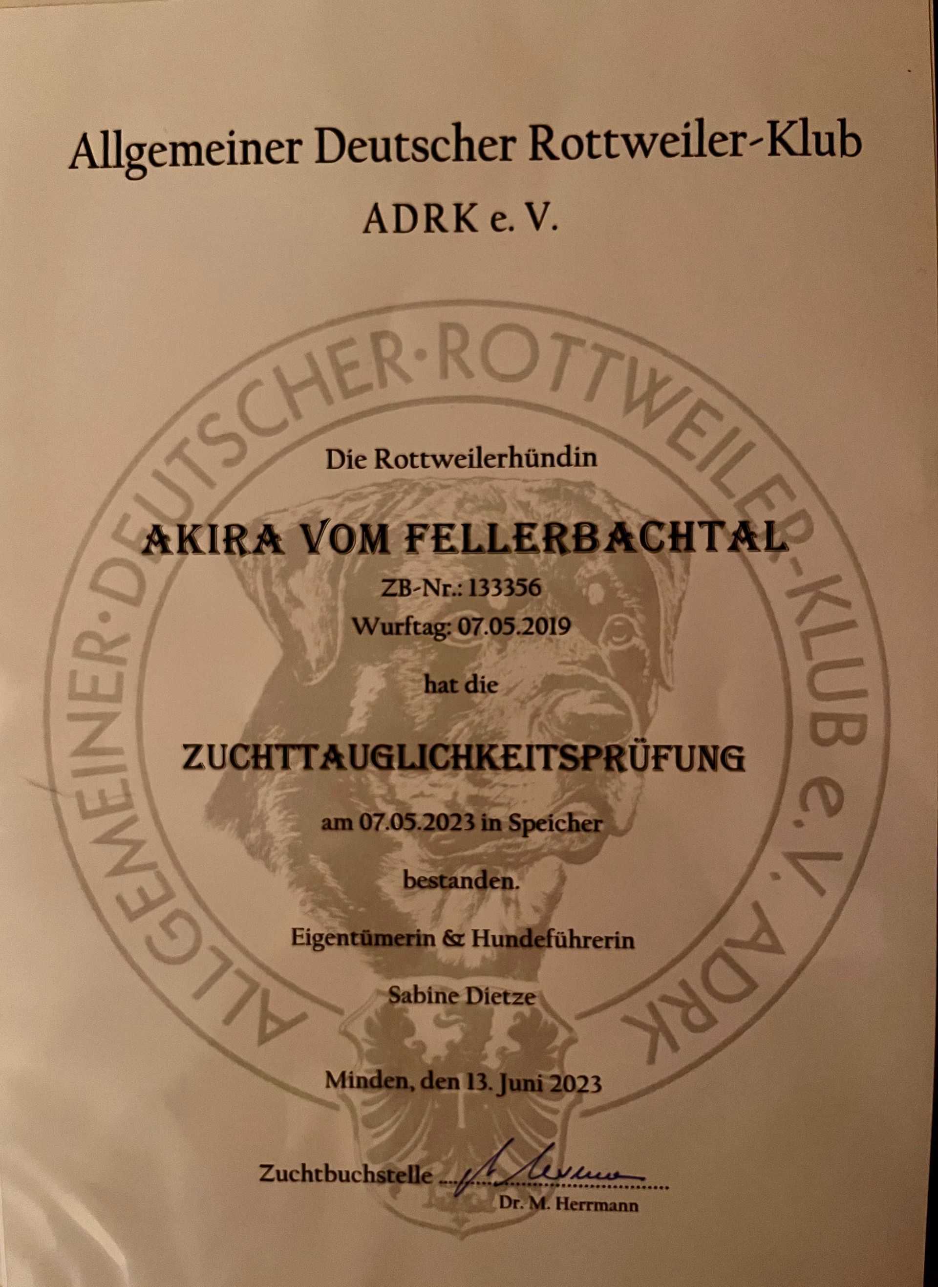 Am 7.5.2023 besteht unsere Akira vom Fellerbachtal ihre Zuchttauglichkeitsprüfung unter Richter Eric Joseph,mit einem hervorragendem Ergebnis !Wir sind sehr stolz auf unsere Nachwuchshündin .